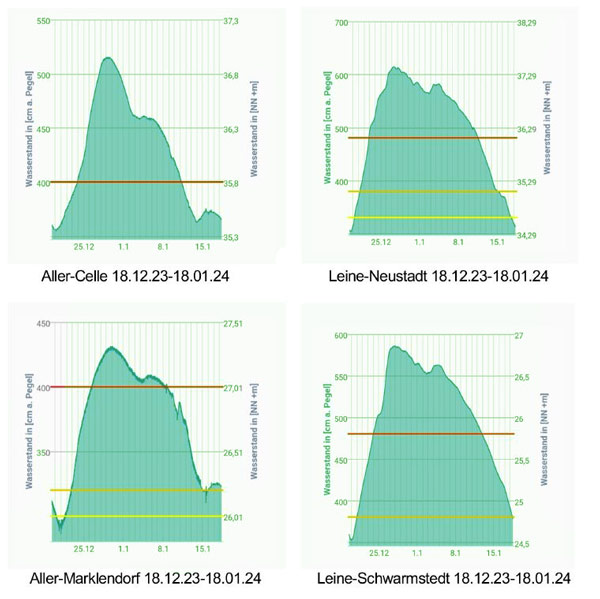 Die Hochwasserlage normalisiert sich weiter. Die vorgelagerten Pegel von Leine (Schwarmstedt, Neustadt, Herrenhausen) sowie der Aller (Marklendorf, Celle) sind weiter rückläufig ca. 10 cm/Tag. Die Aller jetzt rückläufig auf 3,71 m und somit 67 cm niedriger gegenüber dem Höchststand. In der Meisse sinkend auf 3,95 m und 77 cm niedriger gegenüber Höchststand. Das Hochwasser wird als normales Winterhochwasser eingestuft.